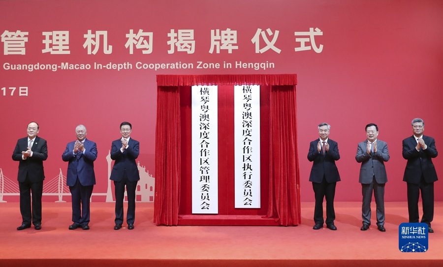 李希、何厚铧、夏宝龙出席揭牌仪式,澳门特别行政区行政长官贺一诚、粤港澳大湾区建设领导小组成员以及有关部门负责同志参加揭牌仪式。揭牌仪式前,韩正与横琴粤澳深度合作区管理团队主要成员合影。