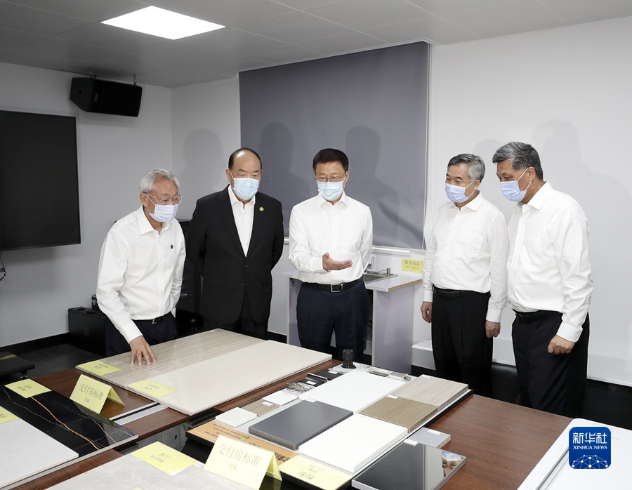 9月17日上午,横琴粤澳深度合作区管理机构揭牌仪式在广东珠海举行。中共中央政治局常委、国务院副总理、粤港澳大湾区建设领导小组组长韩正出席揭牌仪式并讲话。这是揭牌仪式结束后,韩正来到横琴澳门新街坊项目考察。新华社记者 丁海涛 摄