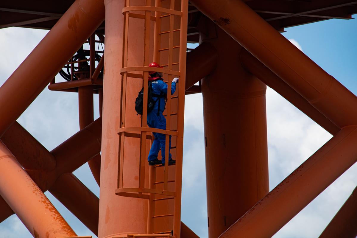 在“桂山一号”风机护栏平台上,几名运维技术人员正在对风机进行例行检修,风机下的运维工作艇在风浪中随波逐流,船上人员上下风机颇为不易。除了例行巡检外,运维人员还要现场监督二期工程的风机安装调试工作,海上作业最大的风险就是上下船时要注意安全,防止落水。
