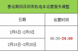 为满足2021年春运期间广大市民的出行需求,深圳有轨电车将于2月6日—2月9日、2月16日—2月28日,共计17天,延长运营服务时间1小时。